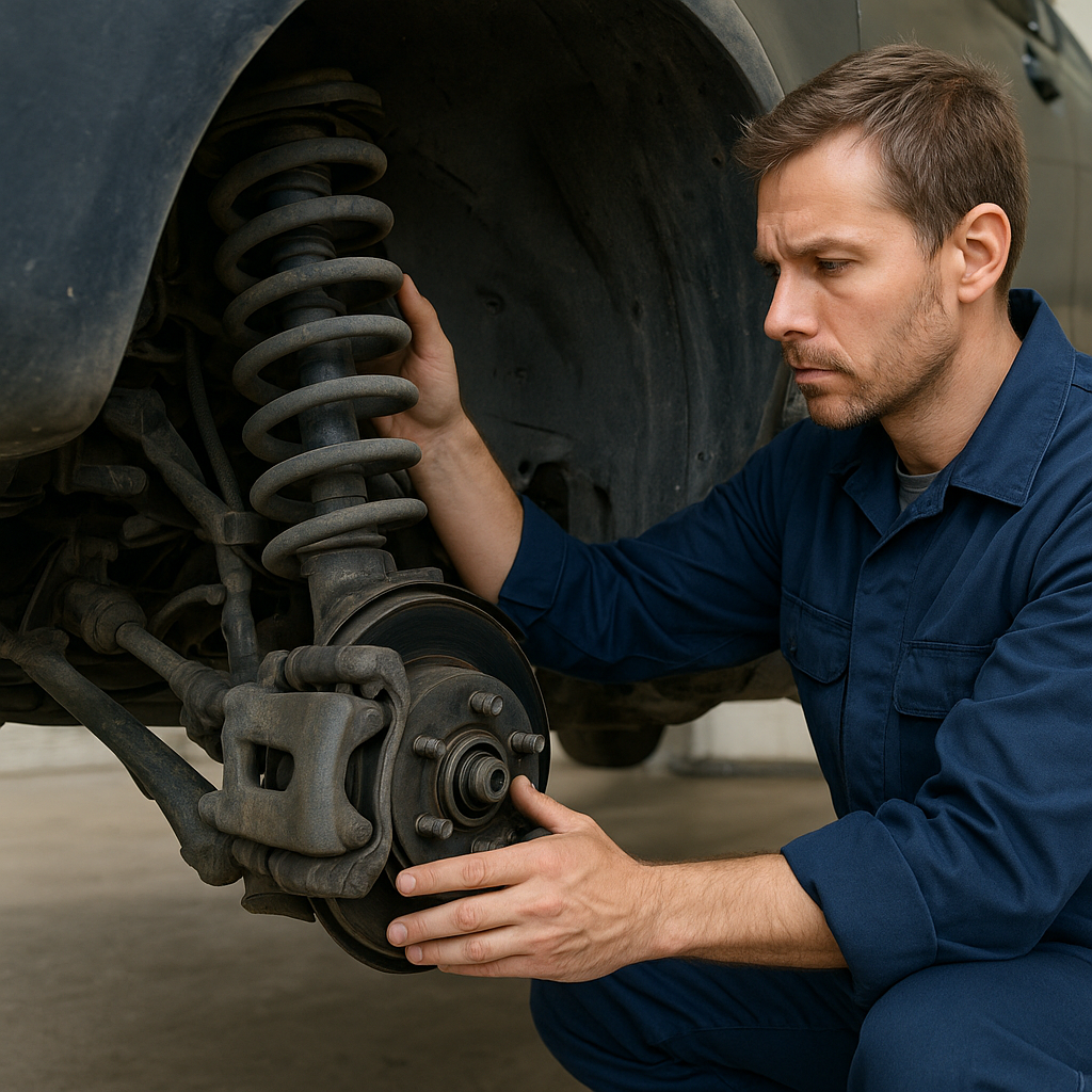 - Obróć koło ręką (samochód podniesiony na podnośniku) i sprawdź, czy nie ma luzów w piastach lub elementach geometrii.